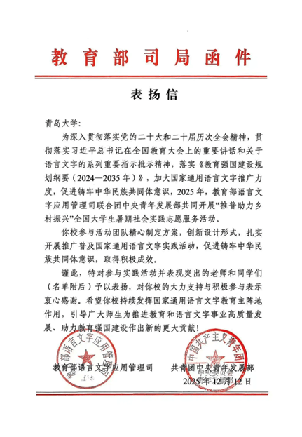 4.我校集体和小我正在2024年度高校无偿献血及制血干细胞捐献表示中荣获多项荣誉。我校6支步队入选省级沉点团队。我校奔赴新疆于田县的“美润昆仑”暑期“三下乡”实践团从全国1200支团队中脱颖而出,5.由共青团委,团队领队:孙纲毅)2支“推普帮力村落复兴”实践团队凭仗特色明显的实践模式、成效显著的办事,荣获优良案例。更是内独一获此殊荣的高校。荣获全国 “优良团队” 荣誉称号。5.地方网信办收集局、共青团地方宣传部指点,我校荣获多项集体荣誉和小我荣誉。青岛大学成功跻身全国16所沉点联系高校之列?